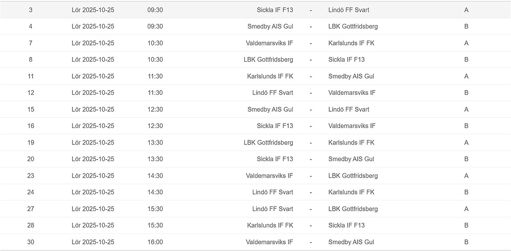 Här har vi spelschemat på Lindö CUP den 25/10.